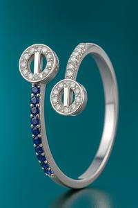 This open style adjustable ring features two circular halos. One half is adorned with dazzling white zircons, while the other side dazzles with a row of deep blue gemstones, offering a perfect contrast of brilliance and grace.