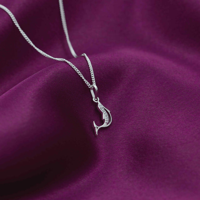 The fins are delicately detailed, with subtle curves and precise lines that mimic the natural flow and movement of a swimming dolphin. The tail fin flares gracefully, adding a sense of dynamic motion to the piece.