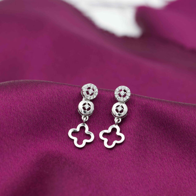 At the bottom of each earring, a delicate four-petal shape adds a touch of floral-inspired elegance. Above the four-petal design, two circular shapes are seamlessly attached, adding an element of modern sophistication. The top circles provide a balanced and harmonious look, enhancing the overall aesthetic of the earrings.